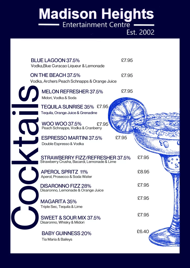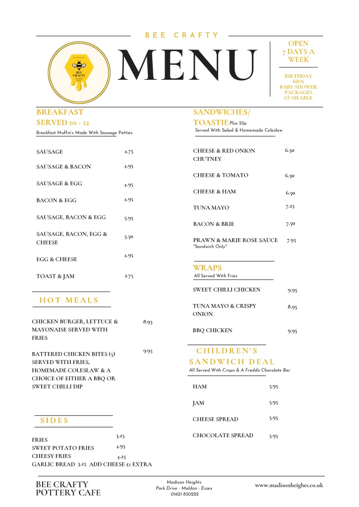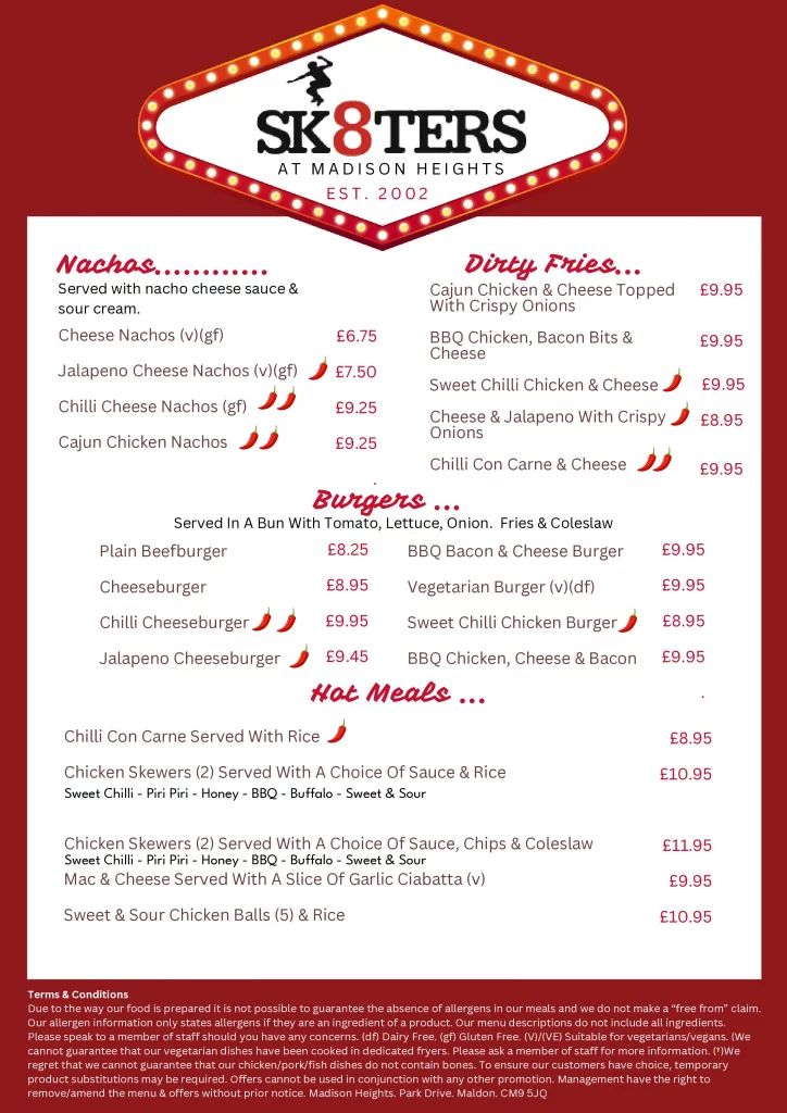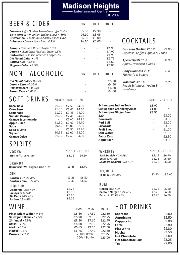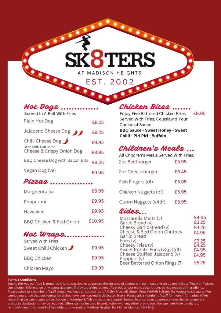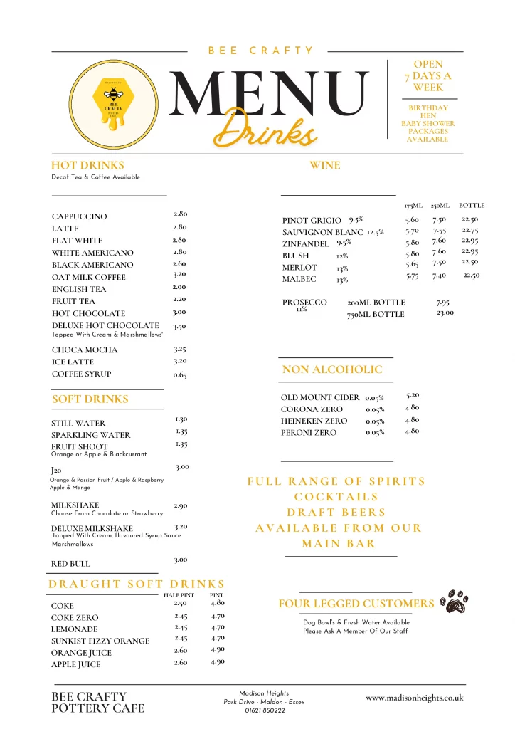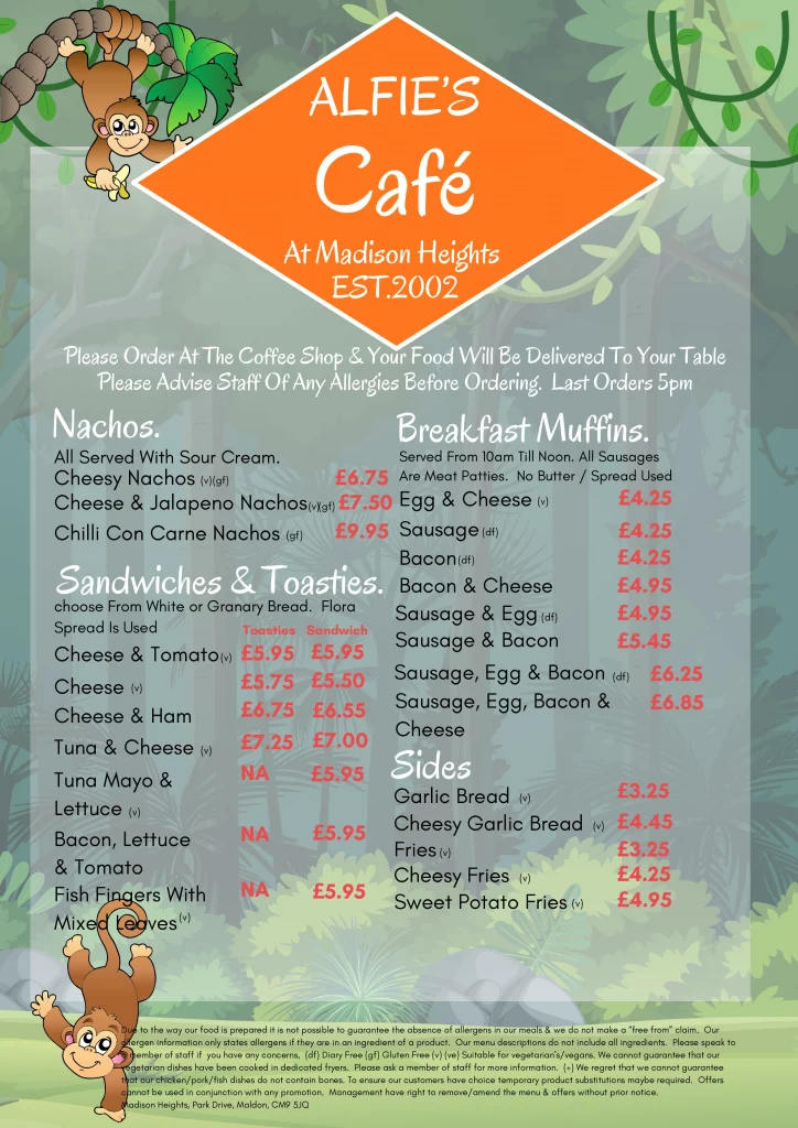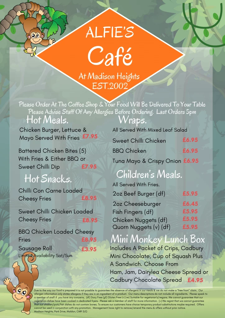 Food & Drinks Food And Drink - Madison Heights Allergen NoticePlease ask a member of staff for the allergen food folder. please ensure you alert the member of staff of any allergies before ordering. Alfies Cafe Henris Dinner Sk8ters Drinks menu Bowl & Bites Pottery Cafe